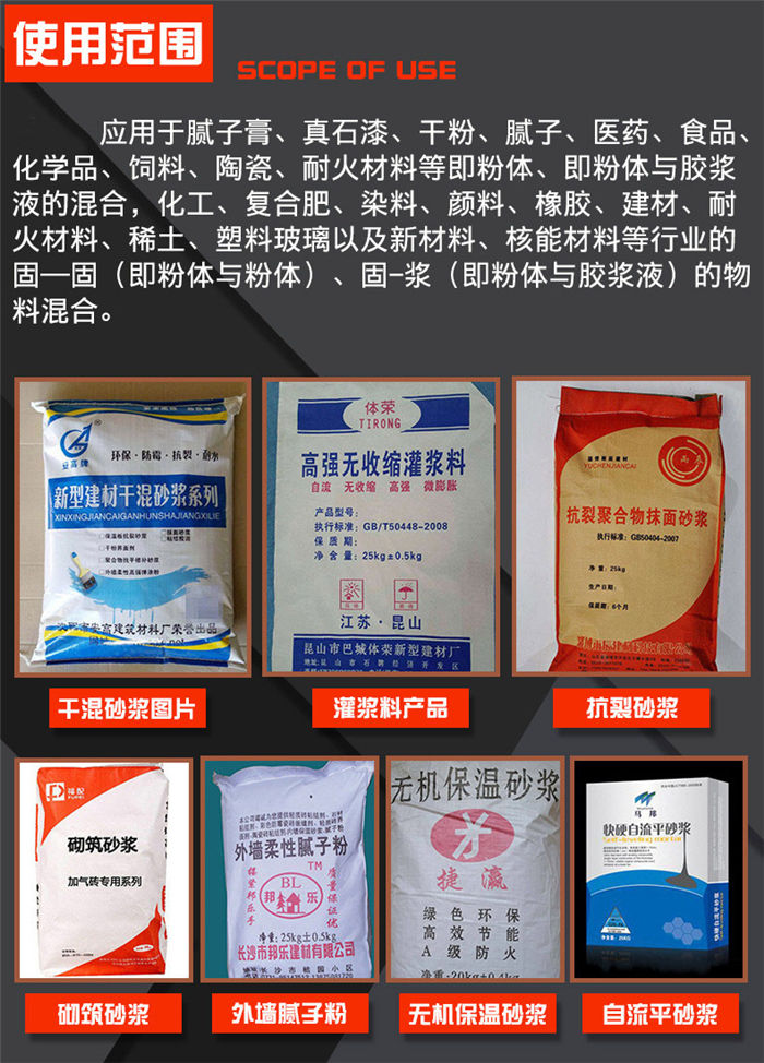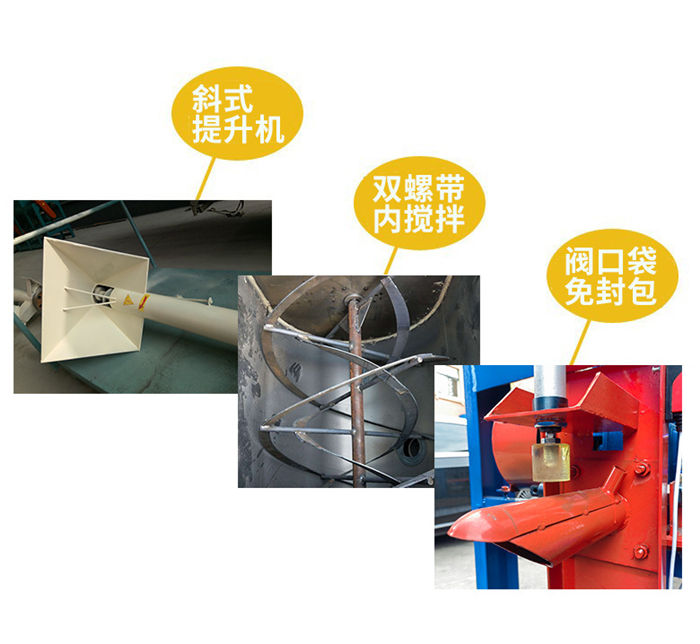 該設(shè)備為全自動(dòng)干粉砂漿攪拌機(jī),整機(jī)四角加上料計(jì)量,適合多種物料混合的攪拌,設(shè)定好斤稱之后,物料由提升機(jī)上料,斤稱達(dá)到自動(dòng)停止,然后接著上第二種物料,以此類推,計(jì)量準(zhǔn)確,省時(shí)省力;出料系統(tǒng)設(shè)計(jì)也是電腦計(jì)量裝置,無需人工二次稱重,閥口袋包裝,無需再次封口,出料速度快,4秒一袋,1人即可操作,省時(shí)省力;攪拌機(jī)機(jī)身為臥式U型筒體,內(nèi)部由內(nèi)外兩層螺帶交錯(cuò)布置,攪拌均勻,混合速度快,5至8分鐘即可攪拌均勻,出料可根據(jù)不同物料的實(shí)際需求定做多個(gè)出料口。