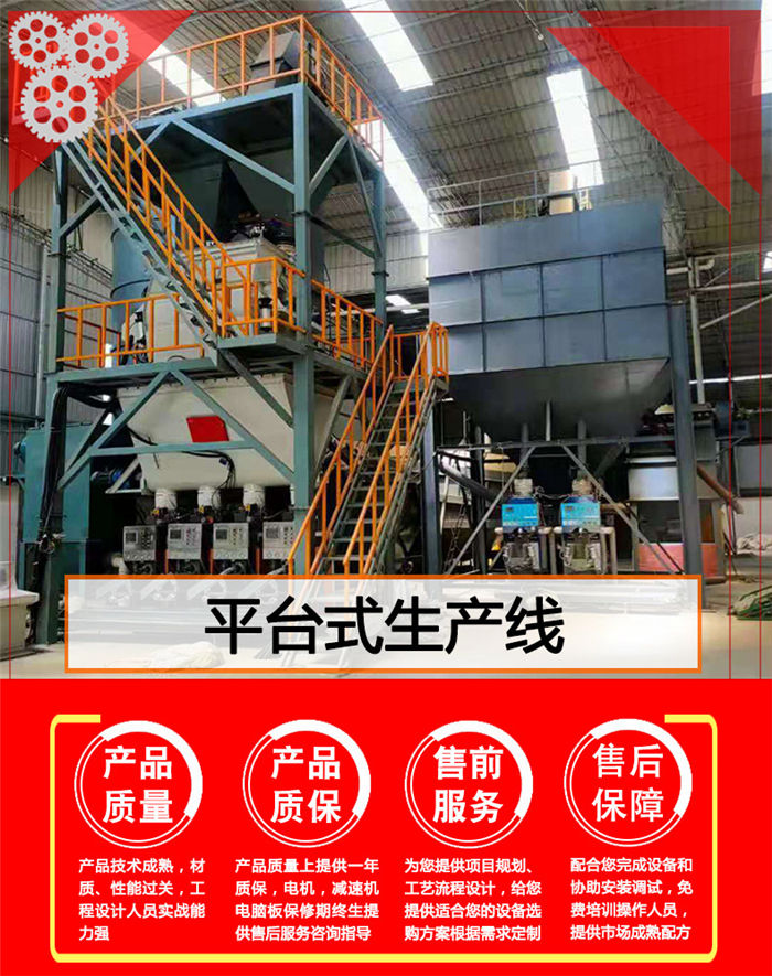 四、混合系統采用4立方大容量無重力雙軸高效混合機,混合時間短,混合精度高,混合速率3-5分鐘一批。高效生產的同時,確保成品砂漿實用效果無虞。