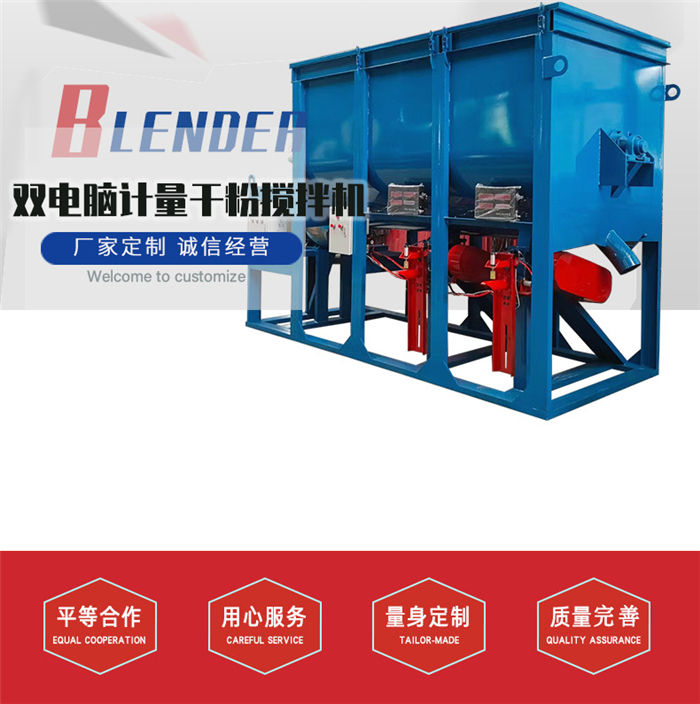 該設備為全自動干粉砂漿攪拌機,整機四角加上料計量,適合多種物料混合的攪拌,設定好斤稱之后,物料由提升機上料,斤稱達到自動停止,然后接著上第二種物料,以此類推,計量準確,省時省力;出料系統設計也是電腦計量裝置,無需人工二次稱重,閥口袋包裝,無需再次封口,出料速度快,4秒一袋,1人即可操作,省時省力;攪拌機機身為臥式U型筒體,內部由內外兩層螺帶交錯布置,攪拌均勻,混合速度快,5至8分鐘即可攪拌均勻,出料可根據不同物料的實際需求定做多個出料口。